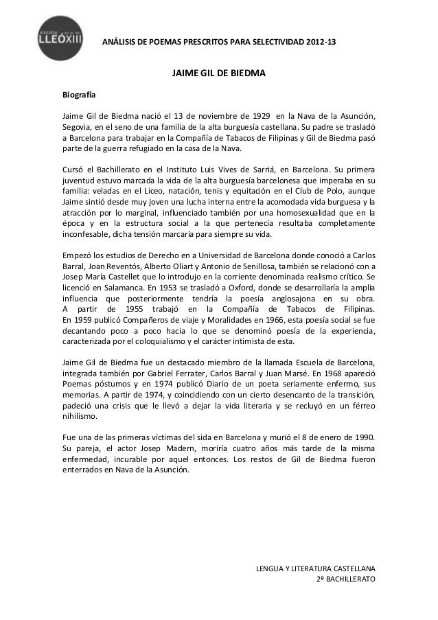 Contra jaime gil de biedma analisis. Jaime Gil de Biedma. La crisis existencial de Gil de Biedma se ve de forma más descarnada en sus cartas El argumento de la obra Lumen. ANÁLISIS DEL POEMA DE JAIME GIL DE BIEDMA CONTRA JAIME GIL DE BIEDMA AUTORÍA.